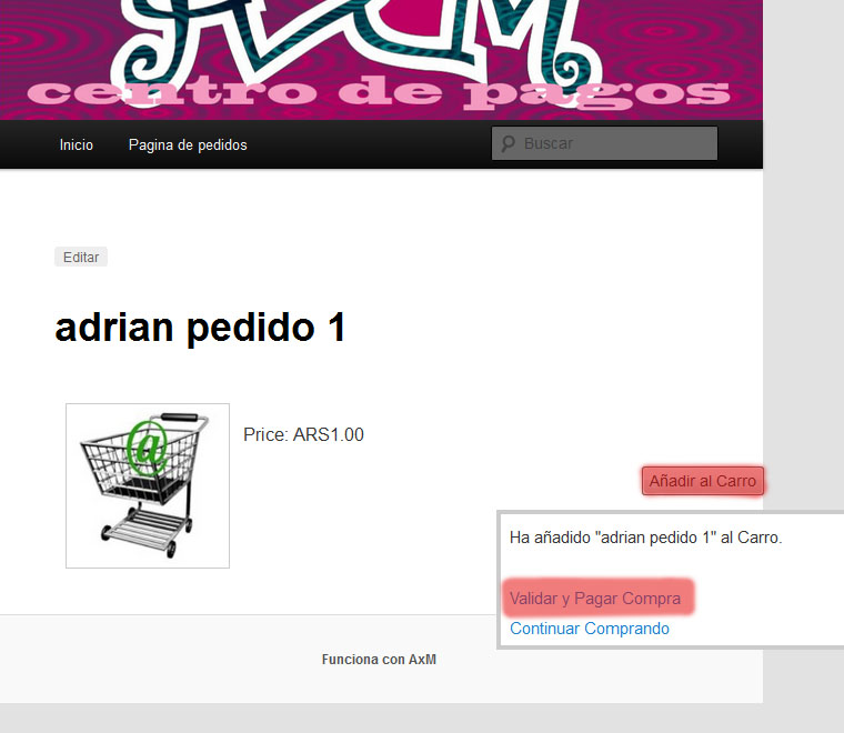Tenés que presionar el botón “Añadir al Carro” y luego “Validar y Pagar Compra”, como muestra la imagen de abajo.